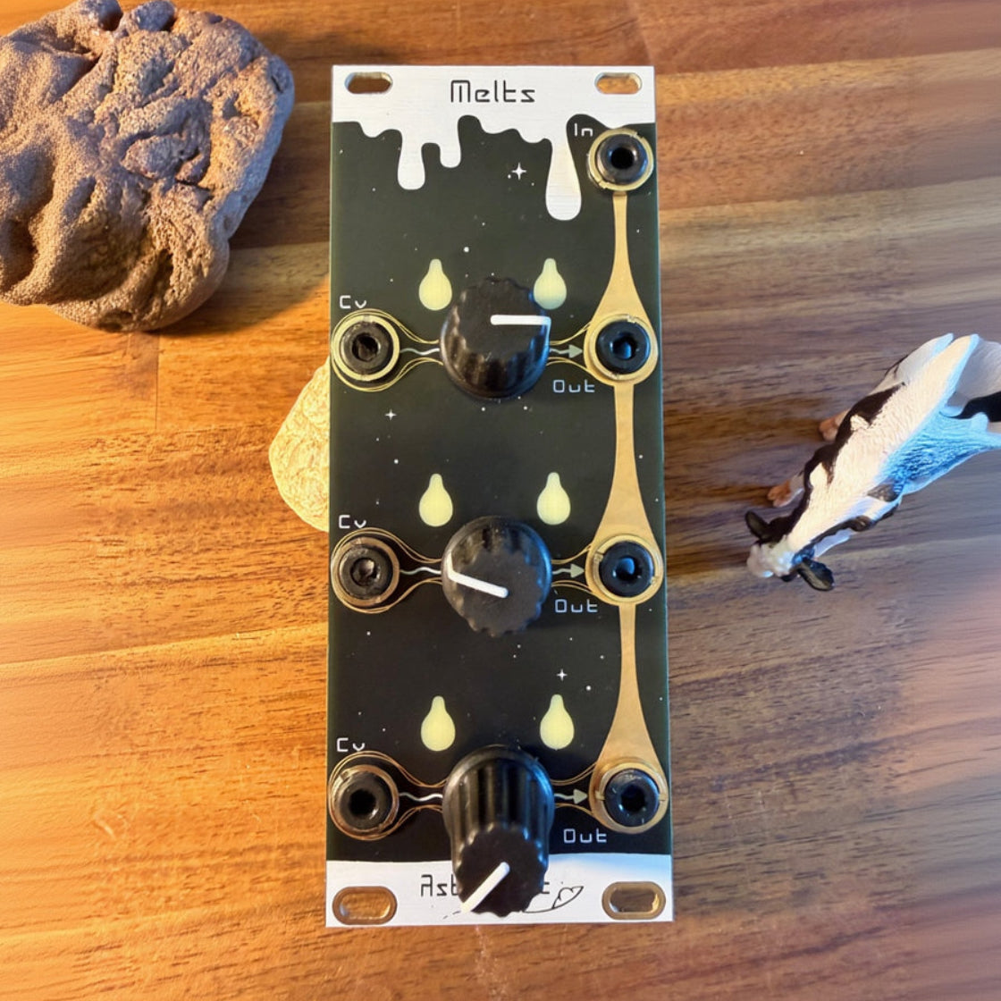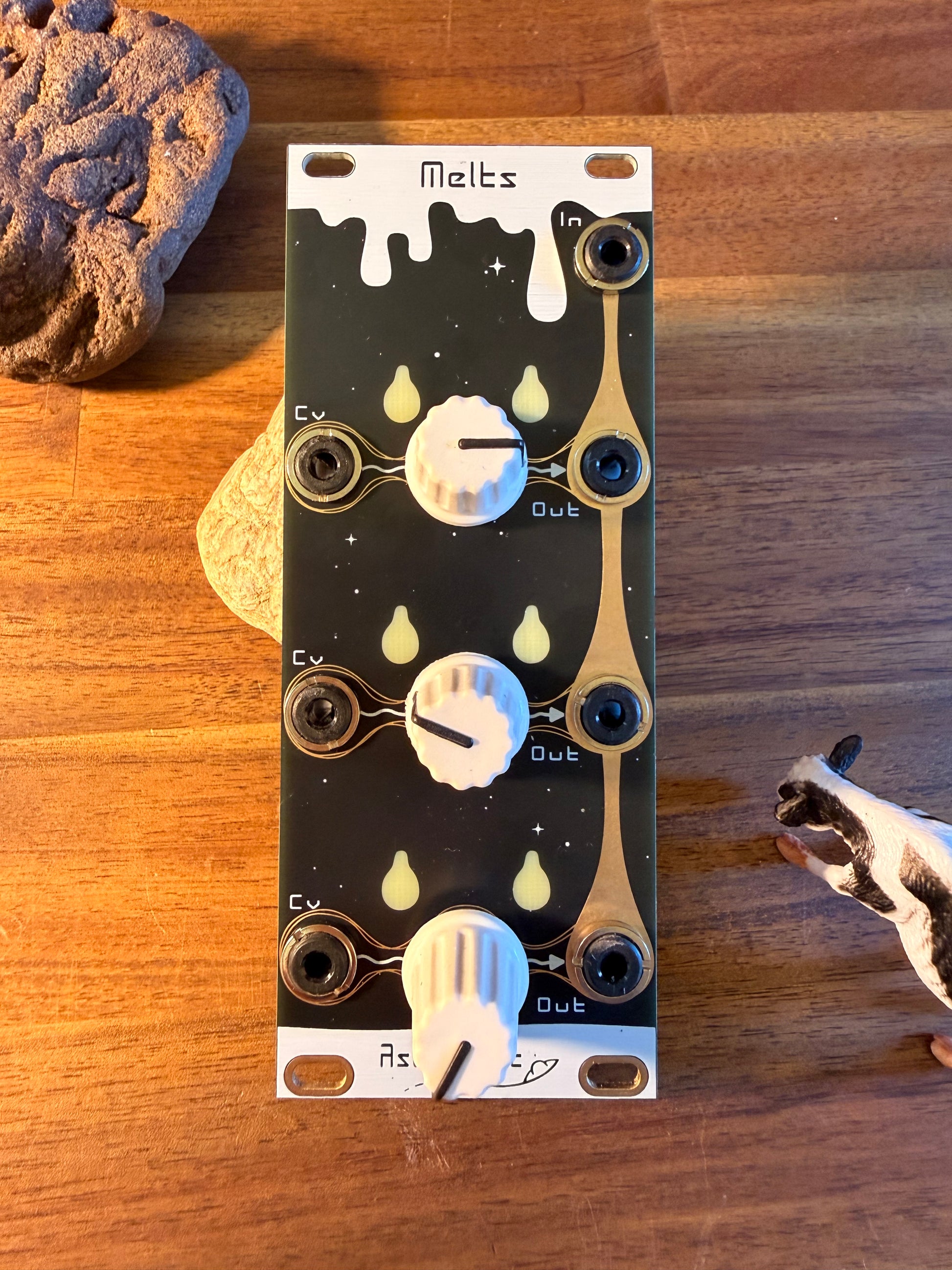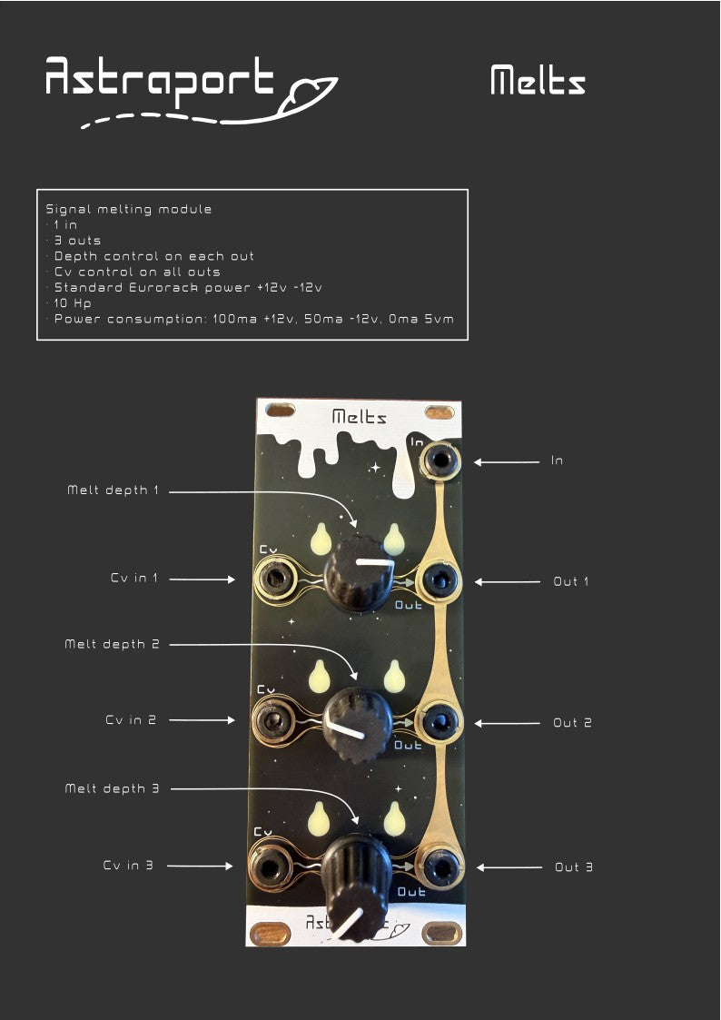 Melts is a CV controllable signal morphing and melting module with multiple outs